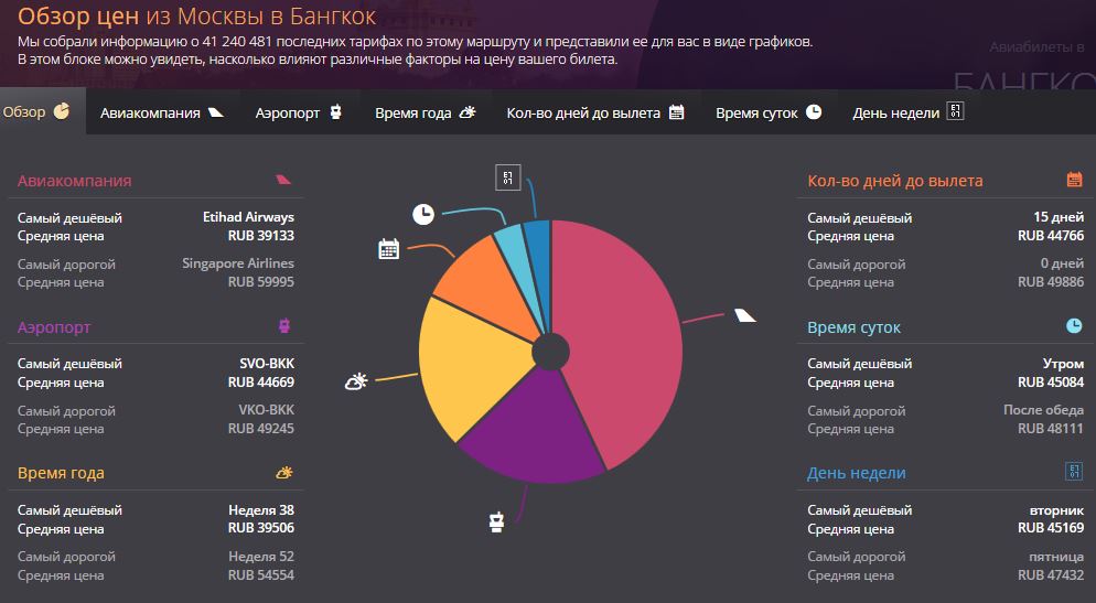 2) С экономической точки зрения, середина сентября – оптимальное время для полета в Бангкок (в среднем за билет 39 506 RUB). В неделю перед Новым Годом среднюю стоимость билетов взвинчивают до 54 554 RUB.